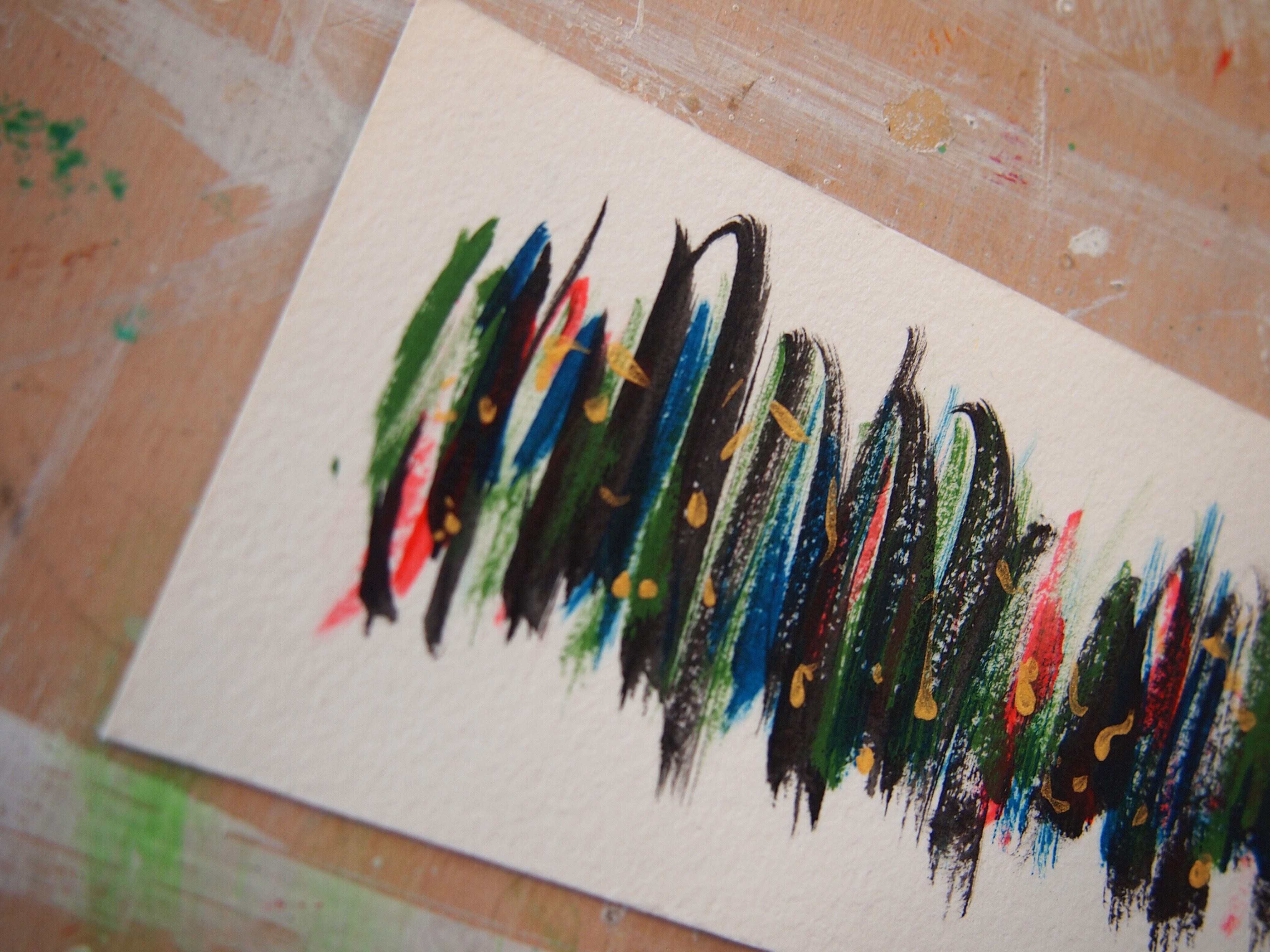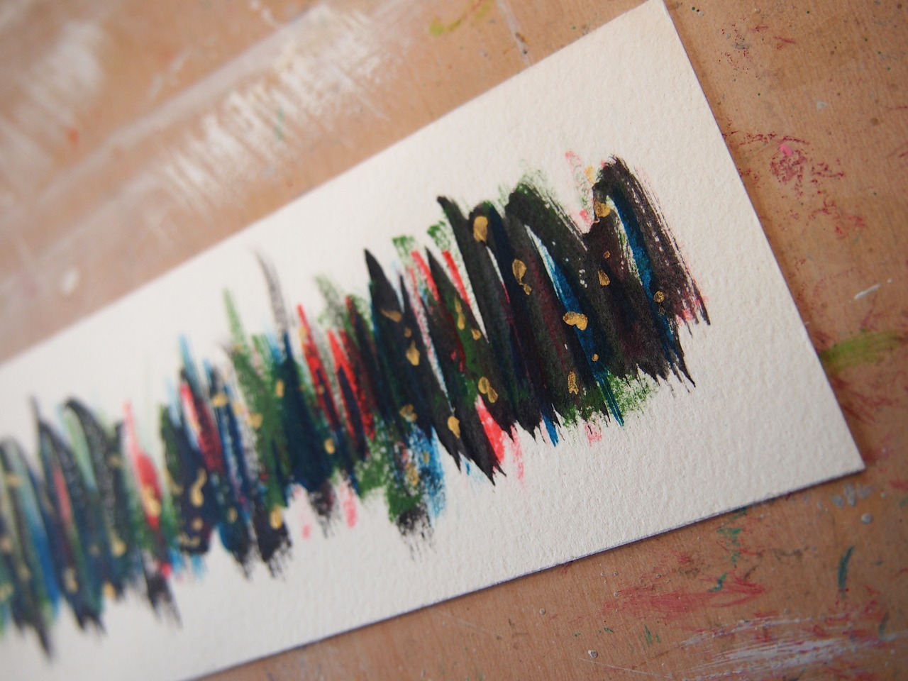 アクリルの滲みと紙の繊細な凹凸が、光の向きによって表情を変えるその断片は、見る人の呼吸に寄り添うように佇みます。