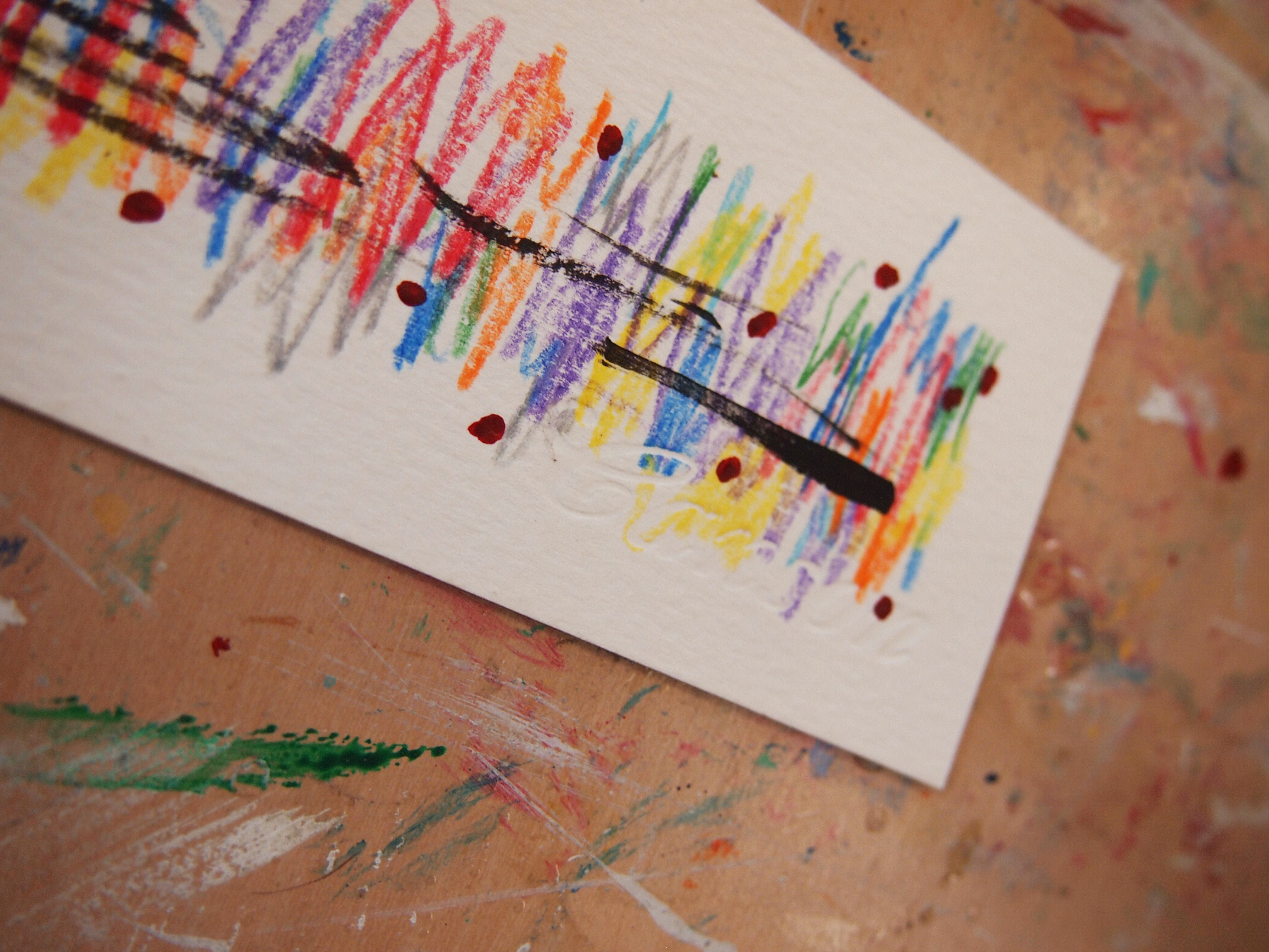 このドローイングは、色鉛筆の繊細な縦のストロークと黒いカリグラフィックラインが交差する、詩的で静かな緊張を宿した一枚です。