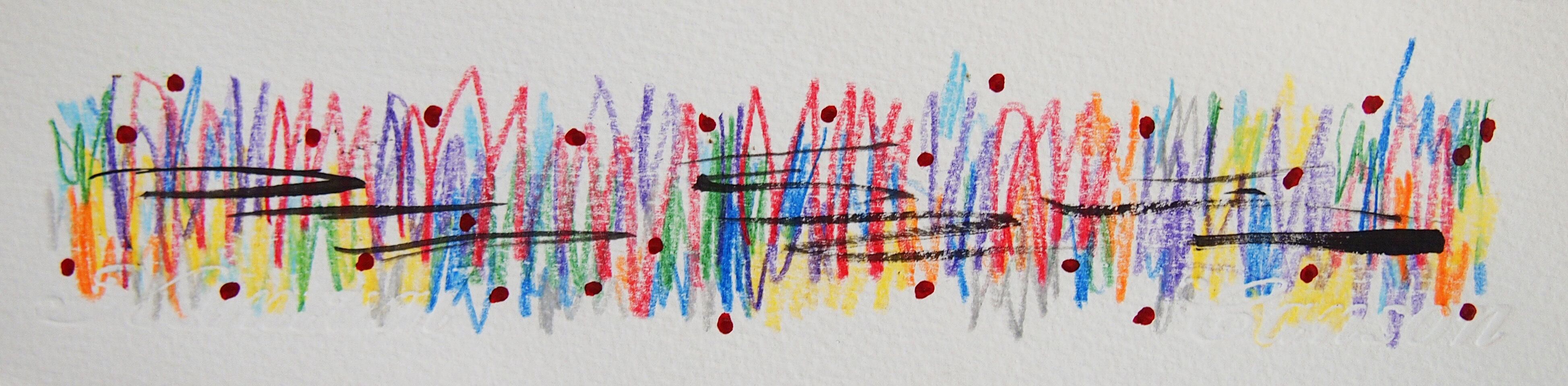 色の層が密に並ぶ中心領域と、その上を自由に走る黒の筆致が視線を誘導し、散りばめられた小さな赤い点が画面に反復とアクセントを与えています。