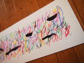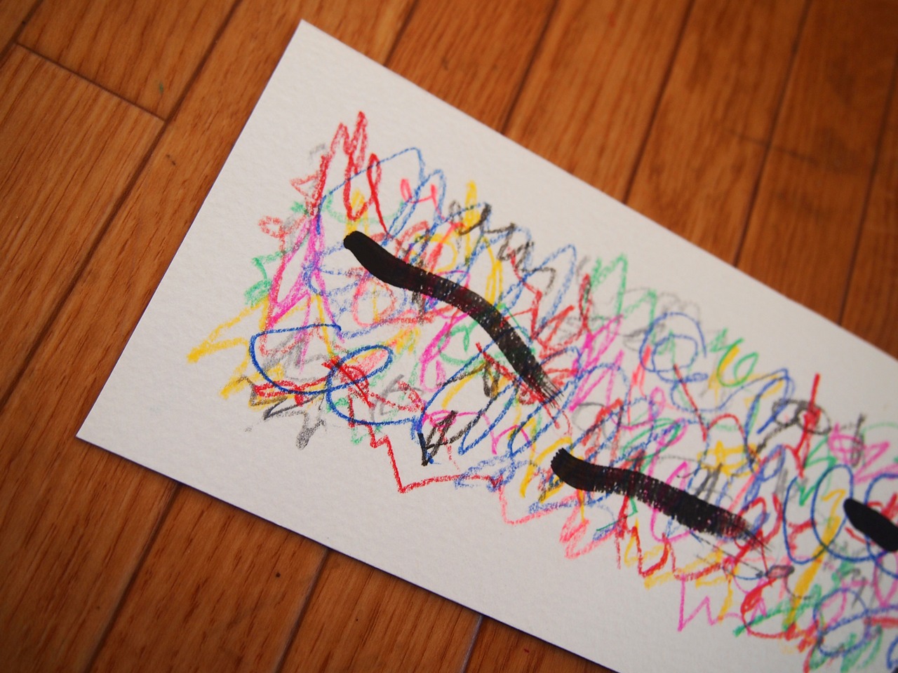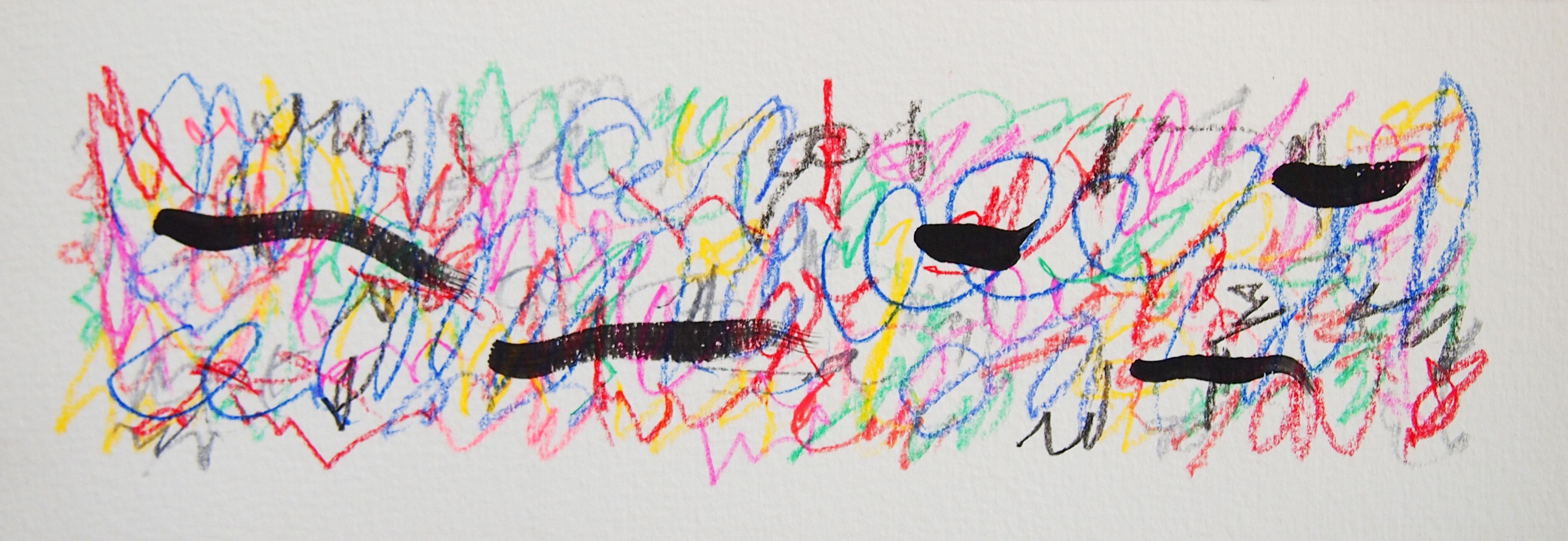 色鉛筆の奔放な線描が横帯状に重なり合い、その上を太く深い黒の筆致が静かに横切る。