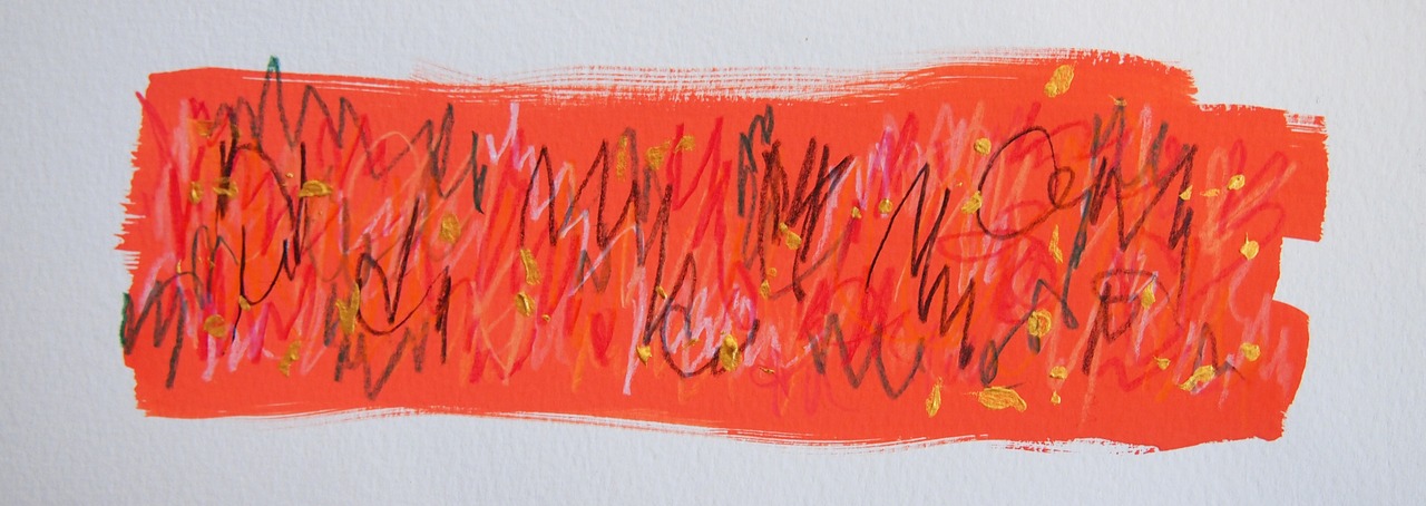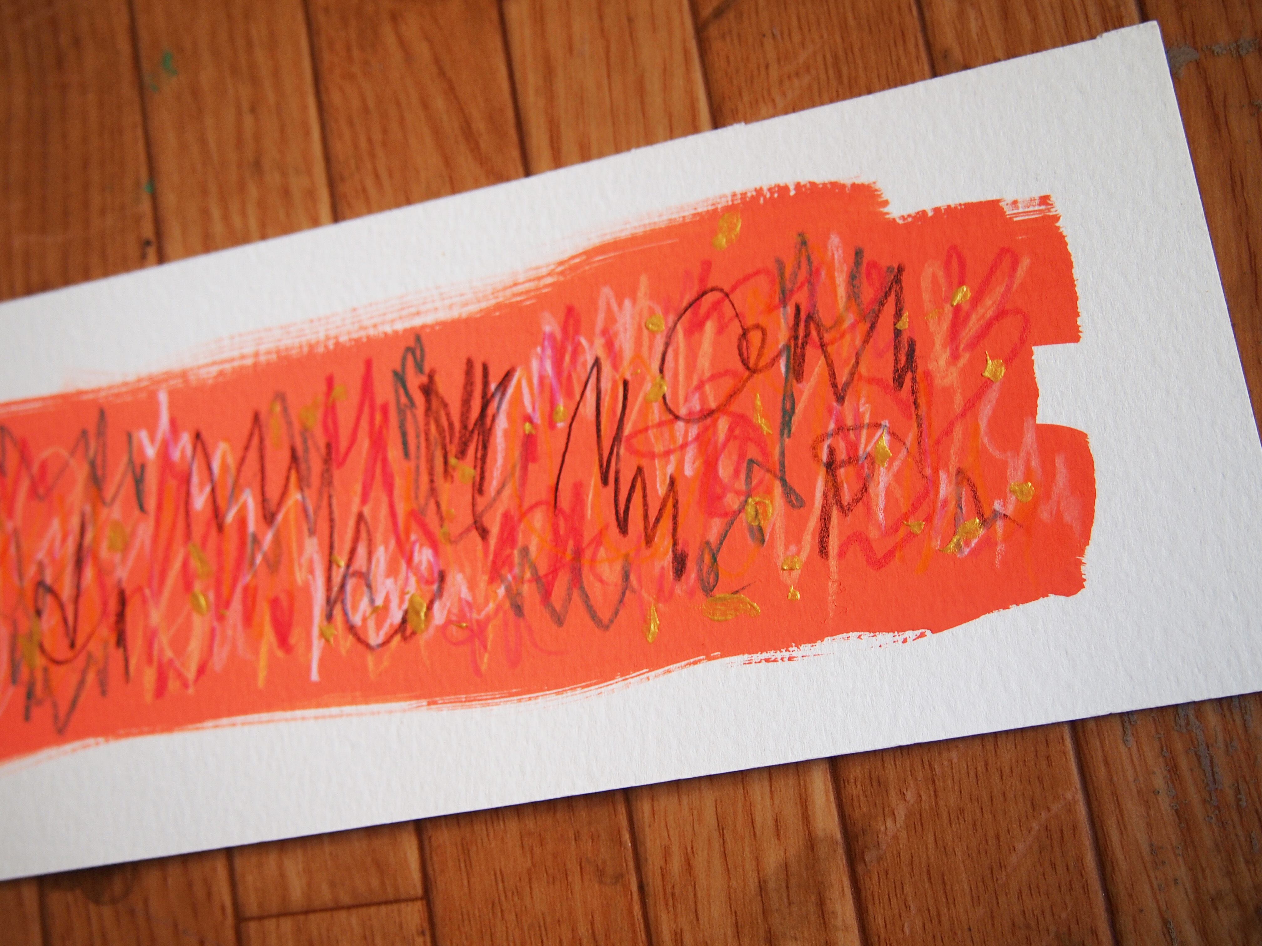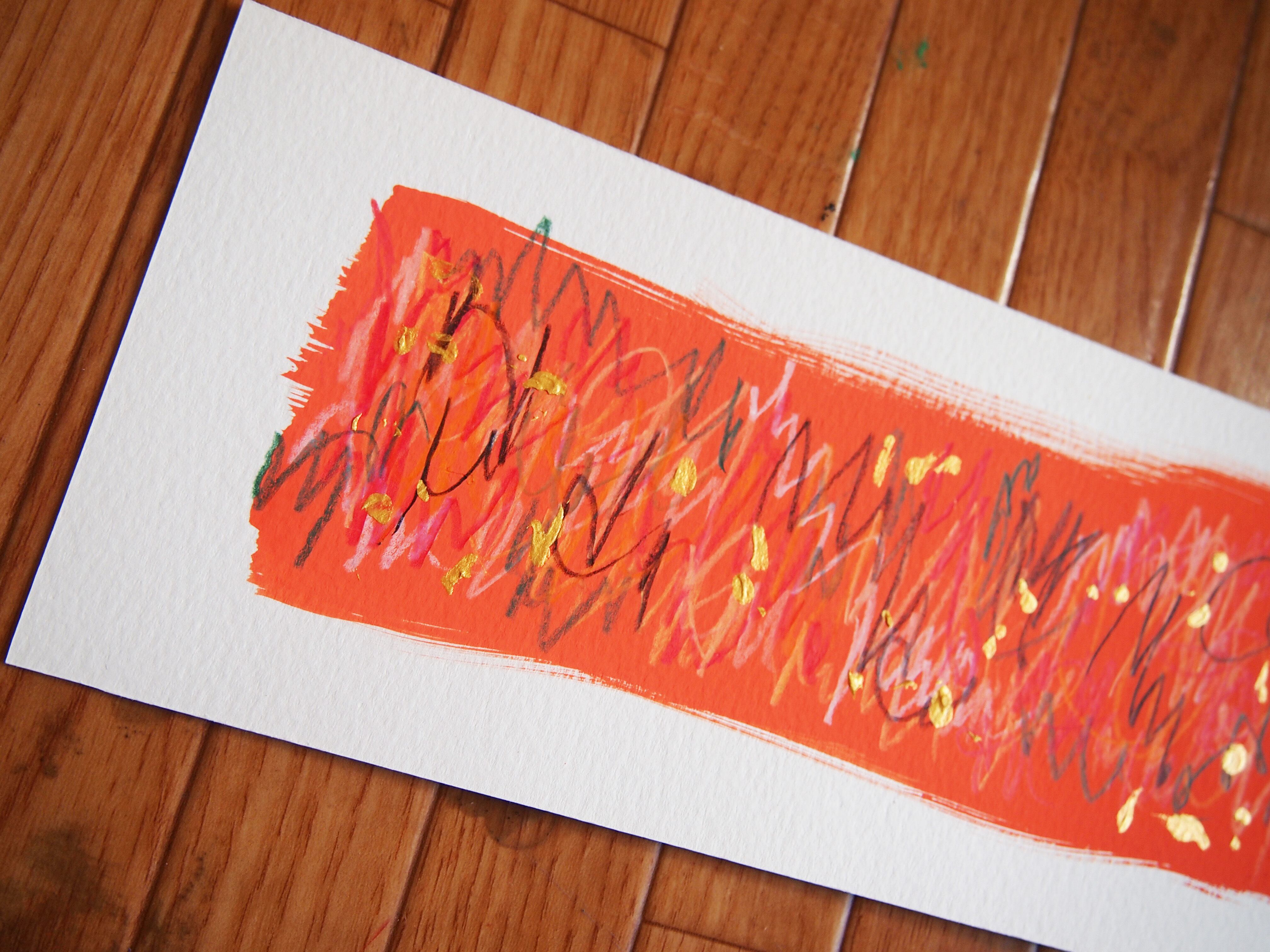 アクリル絵具の赤橙色の太い筆致が、色鉛筆の繊細な線と重なり合うことで生まれる緊張感と余韻。