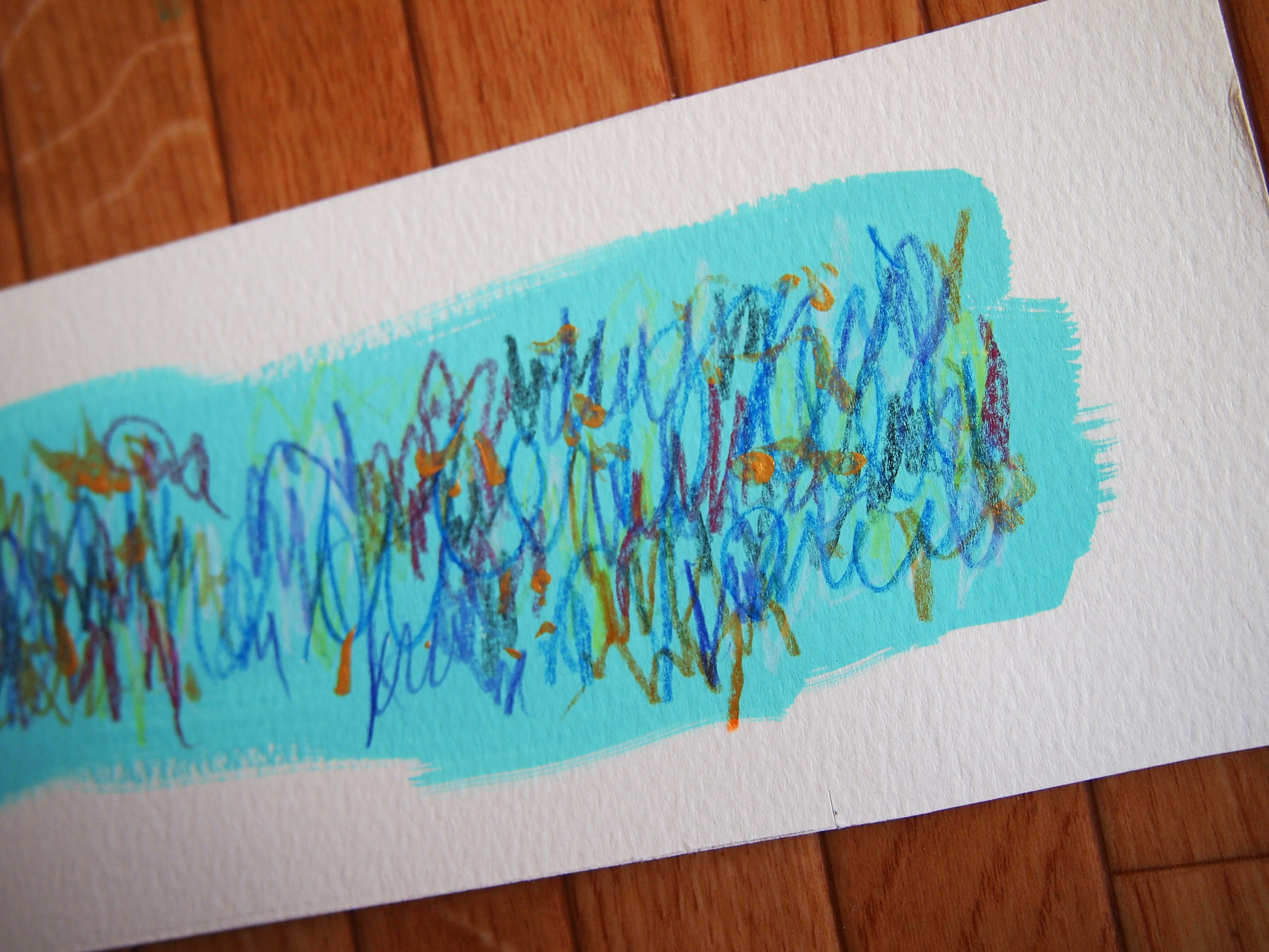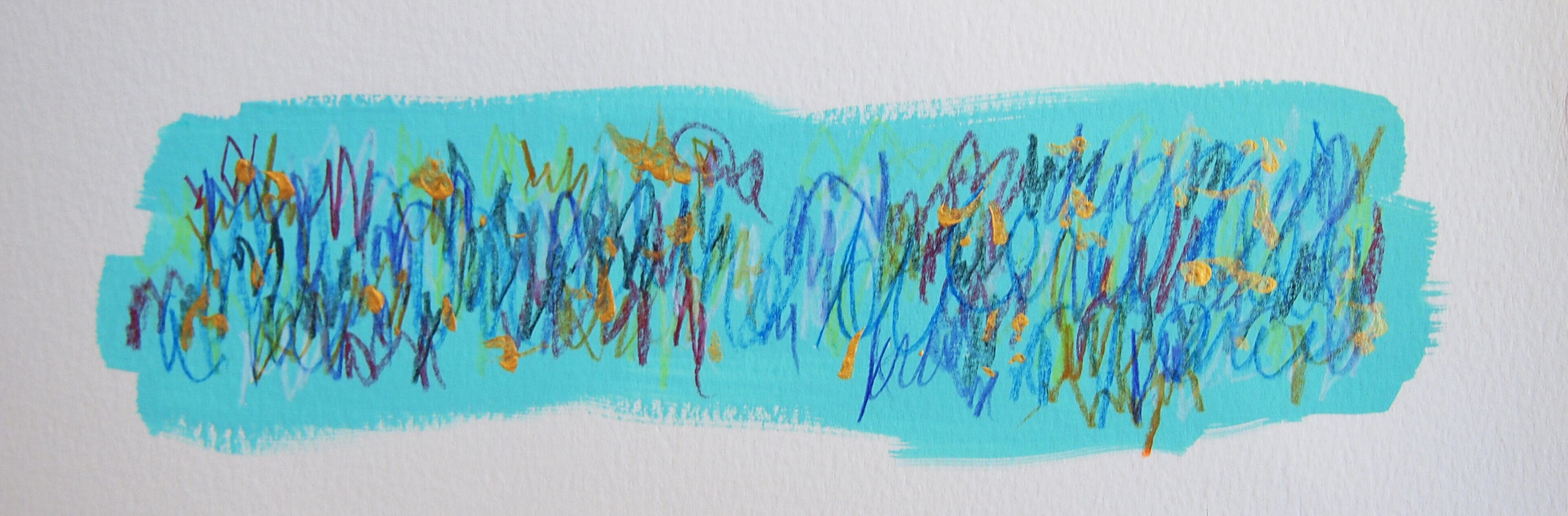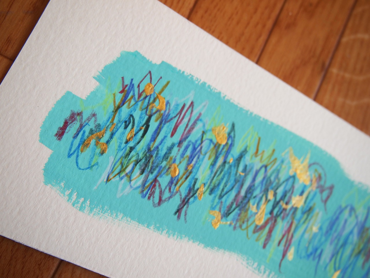 ターコイズの水平の色面を基調に、青・紫・オレンジ・黄・緑の線やスクラッチが軽やかに重なり合い、画面のなかでリズムと呼吸が生まれます。
