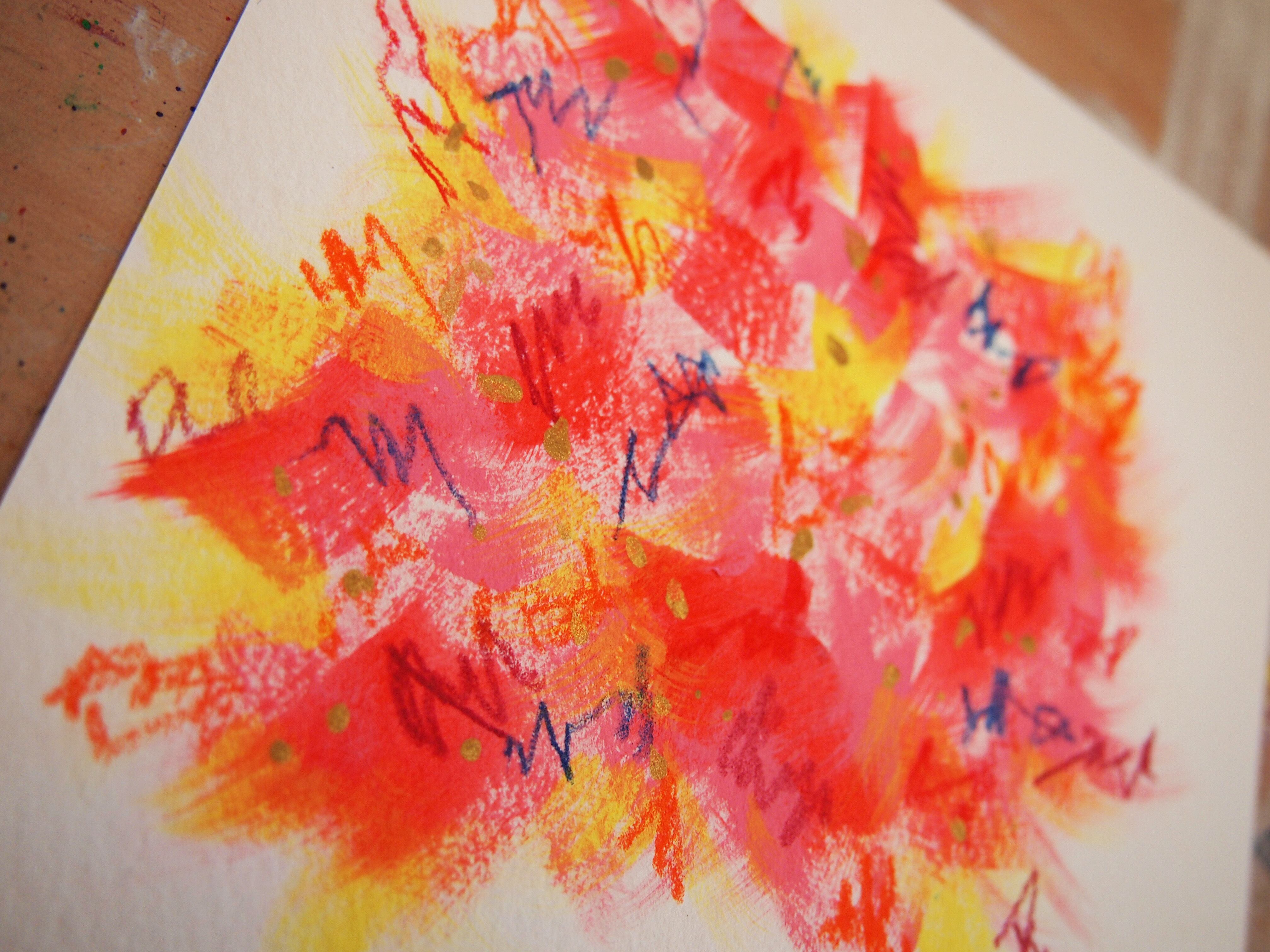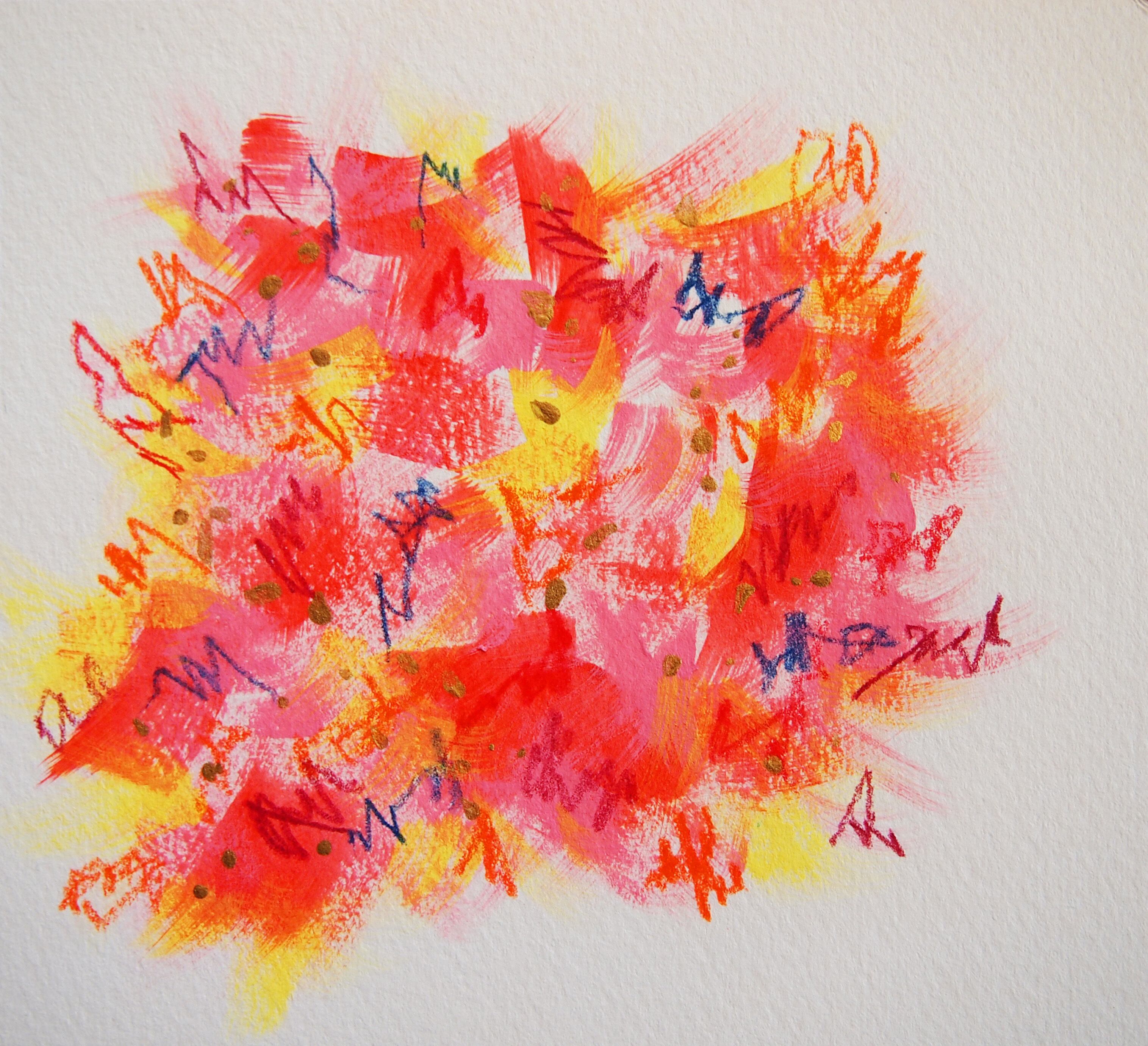 2021年に生まれたこの小さな抽象画は、赤やピンク、オレンジが織りなす温かな光のうねりに、青と緑のクレヨン線がリズムを刻む一枚です。