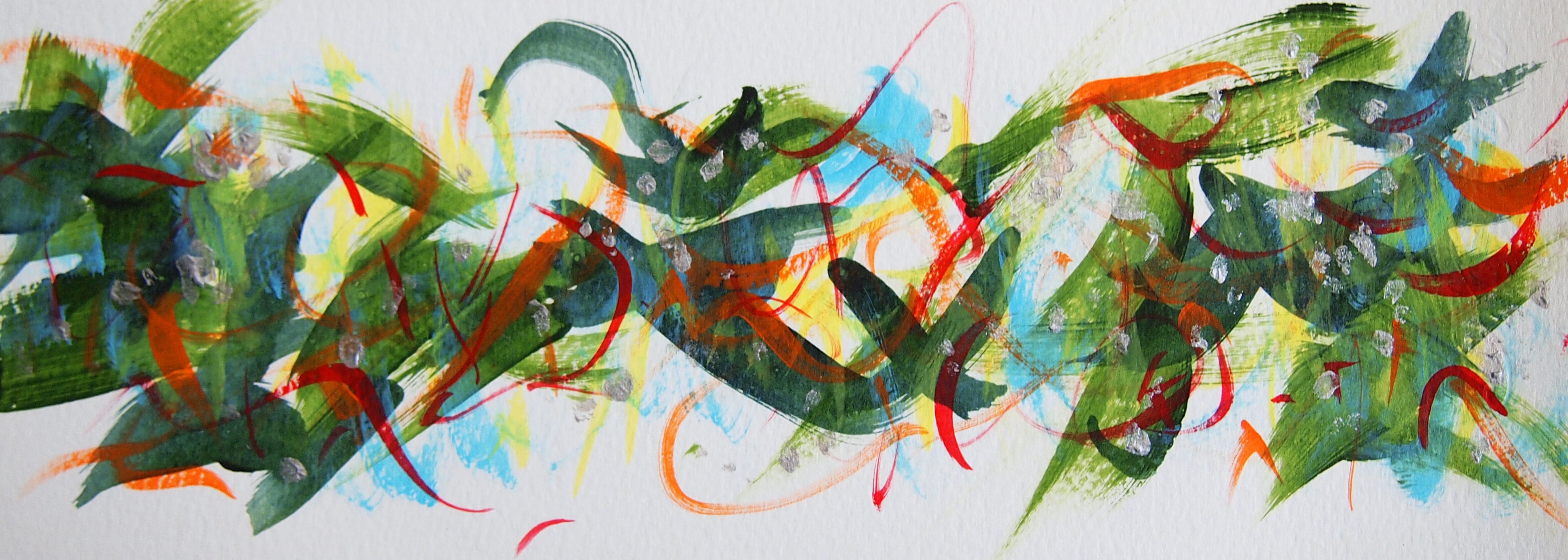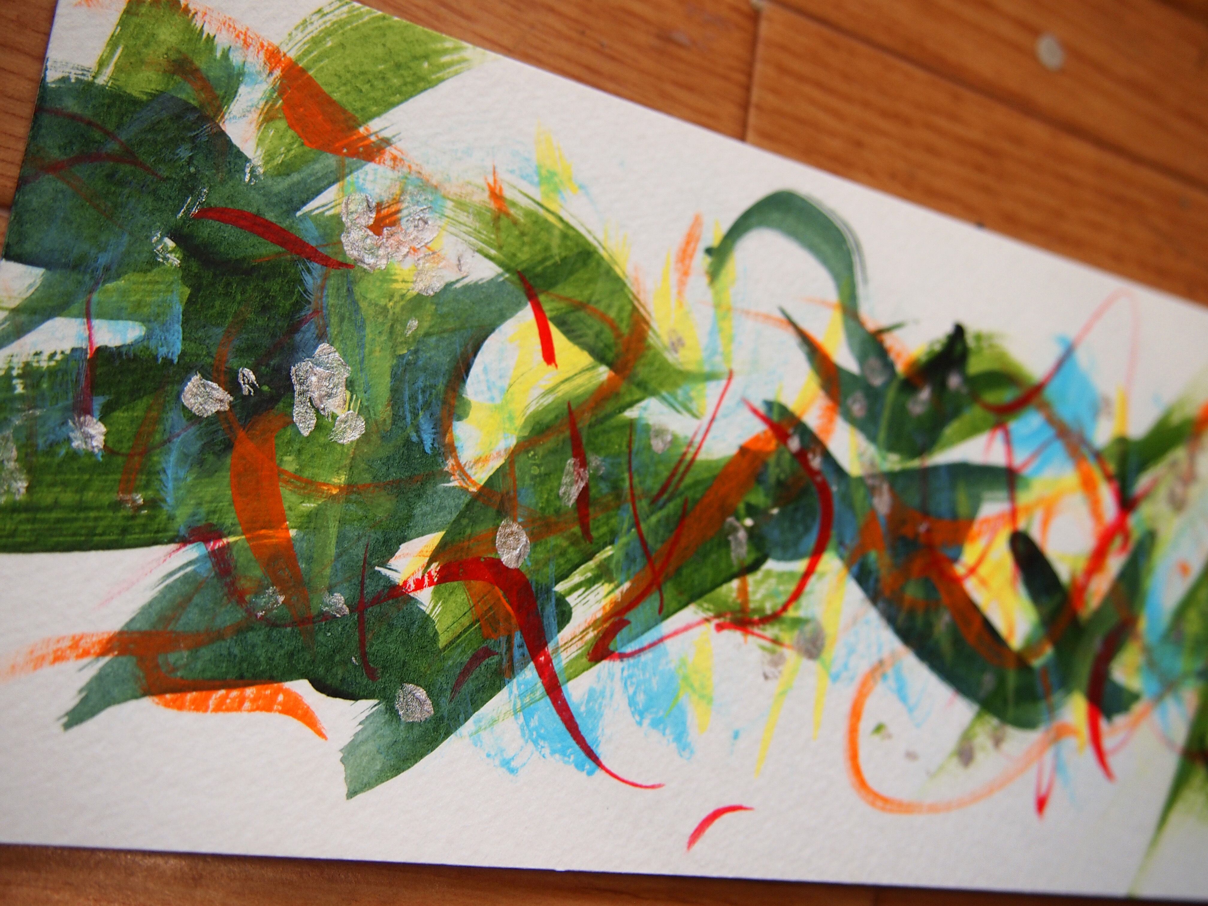 緑、赤、オレンジ、青、黄色の筆致が曲線的に絡み合い、厚みと透明感が生むリズムは、まるで感情の流れが風のように舞い、色彩の層が呼吸するよう。
