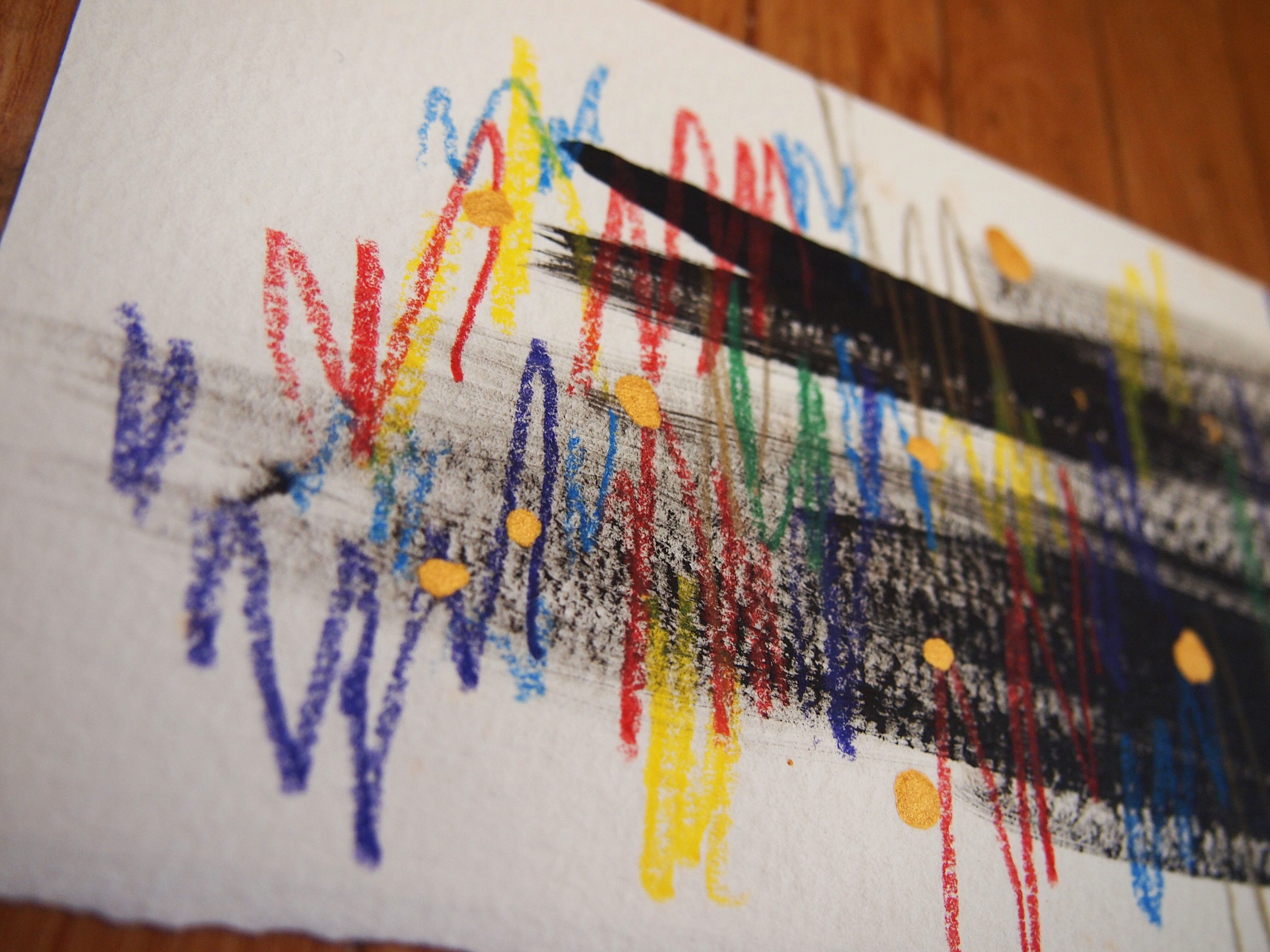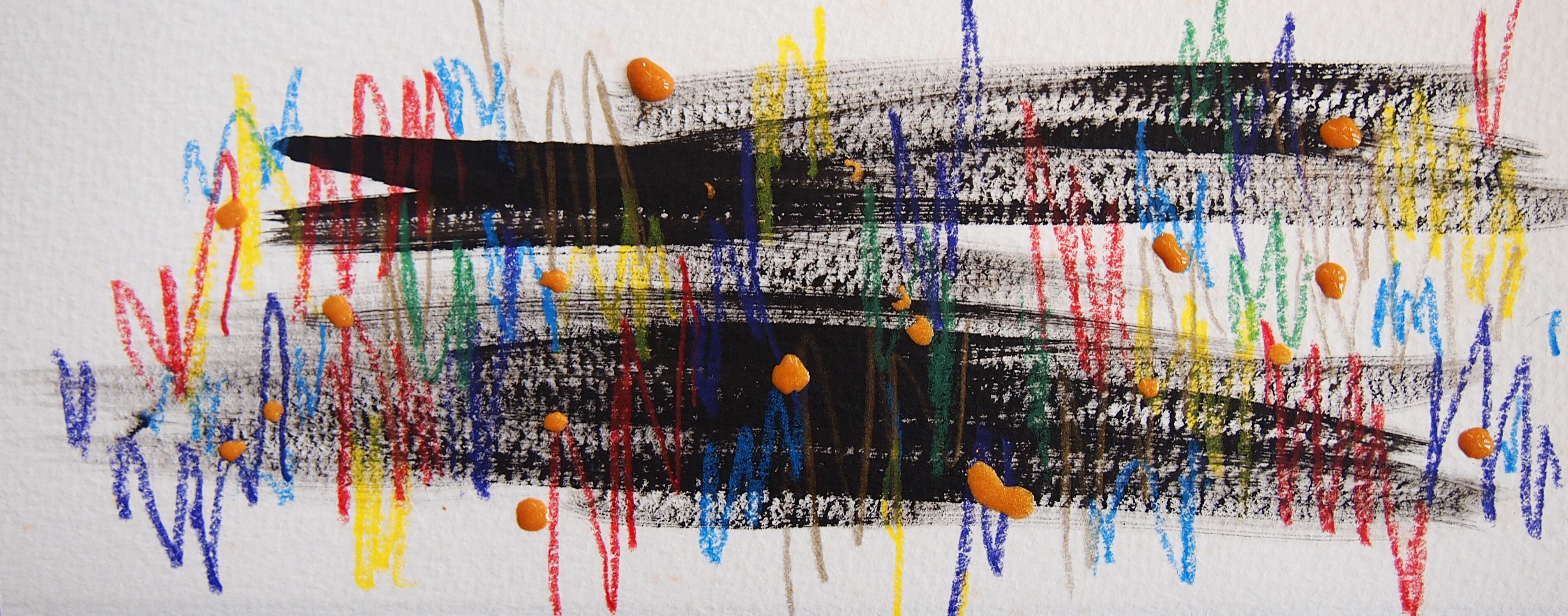 この作品のポイントは、複数の画材が交差する「密度」と「隙間」のバランスです。