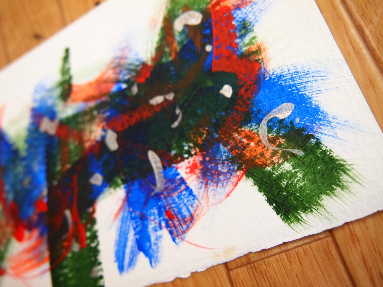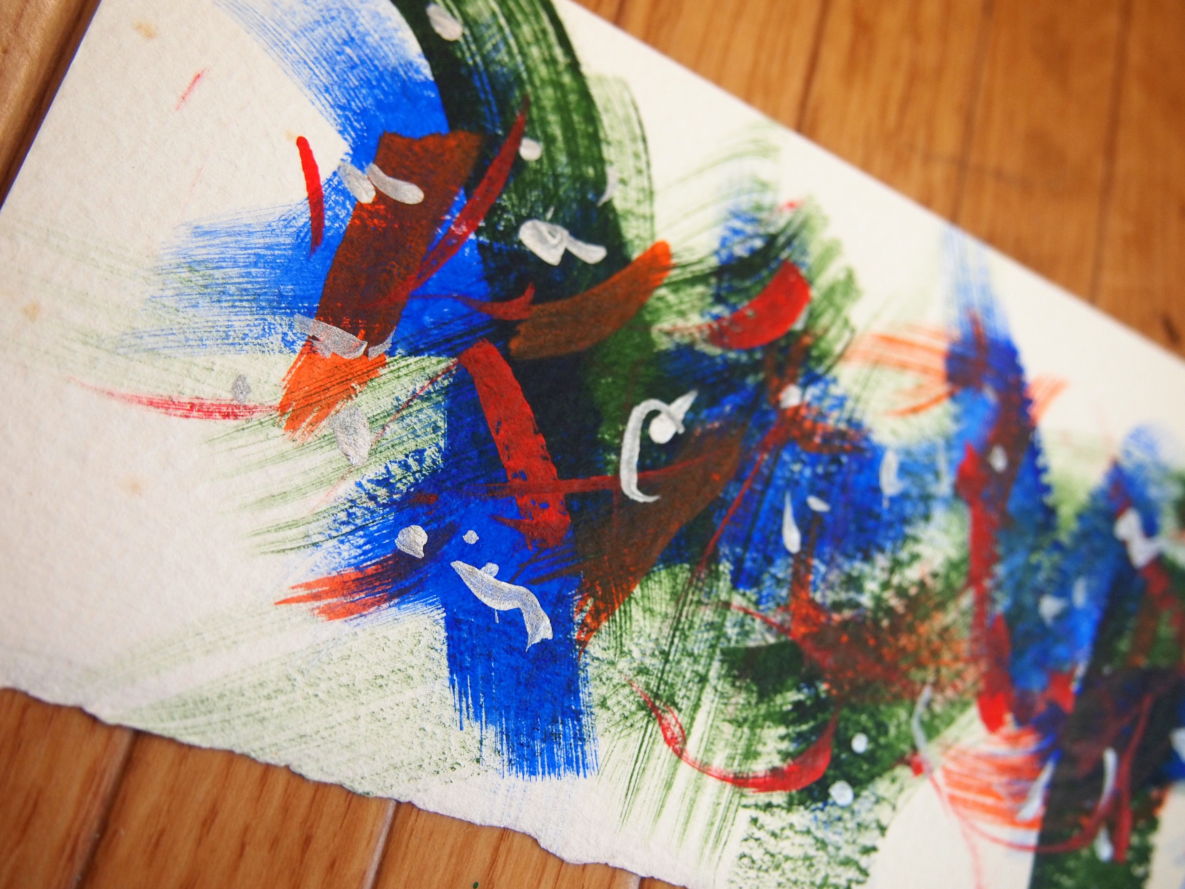 青・赤・緑・黒の筆致が重なり合い、白の点描が舞うように散りばめられた構成は、まるで感情の波が空間を横断し、静かな余白に着地するよう。