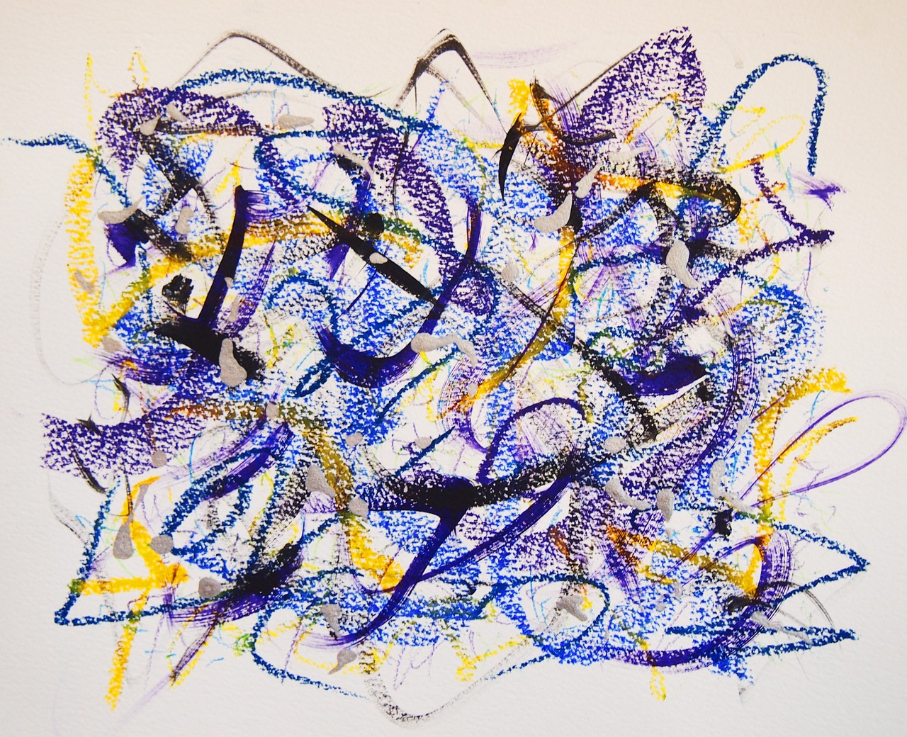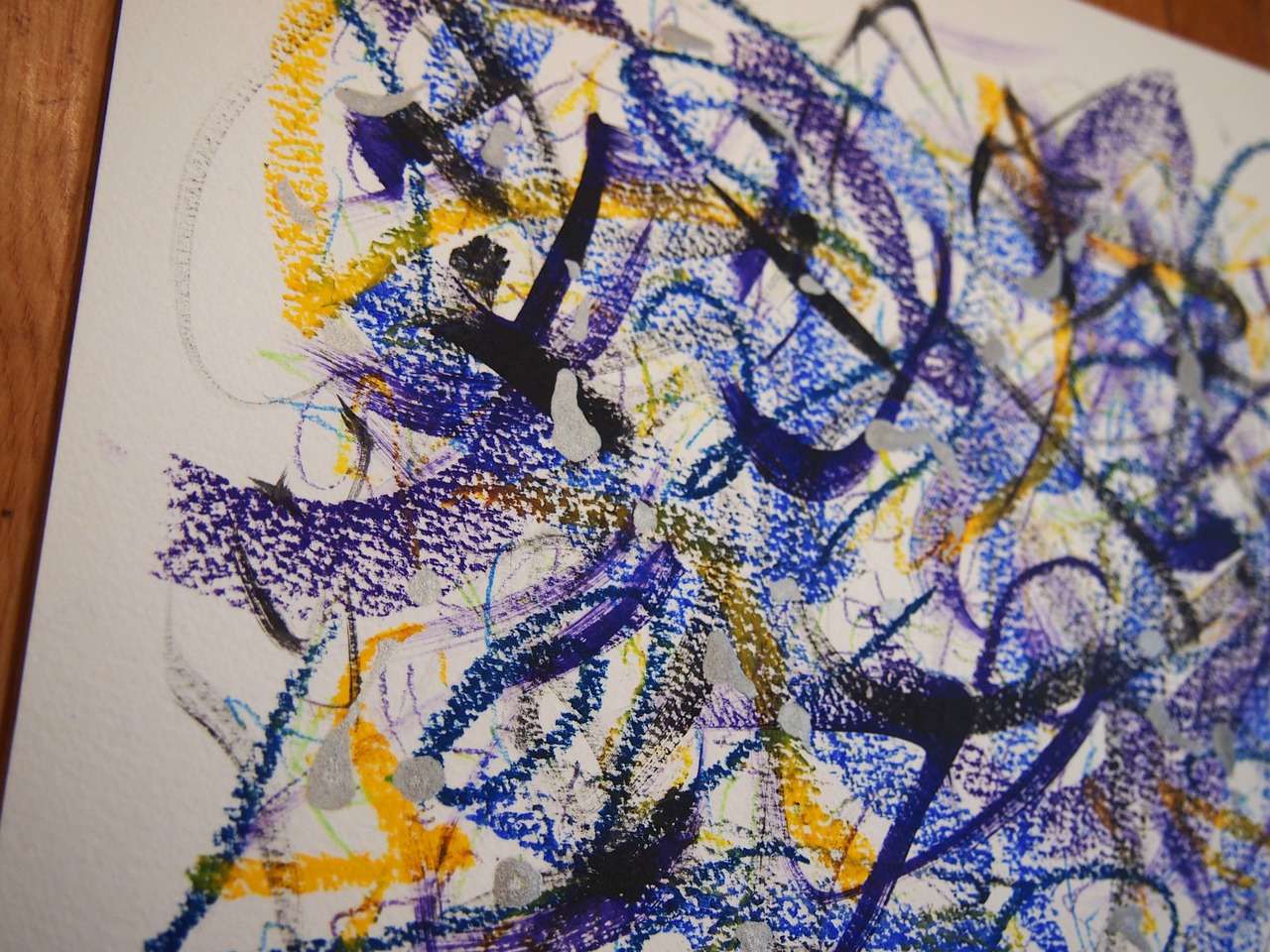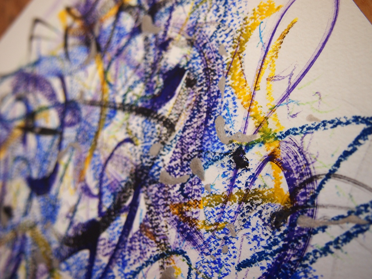 青・紫・黄・黒の線が紙の上で重なり合い、まるで感情の層が時間を超えて交差しているような構成。