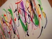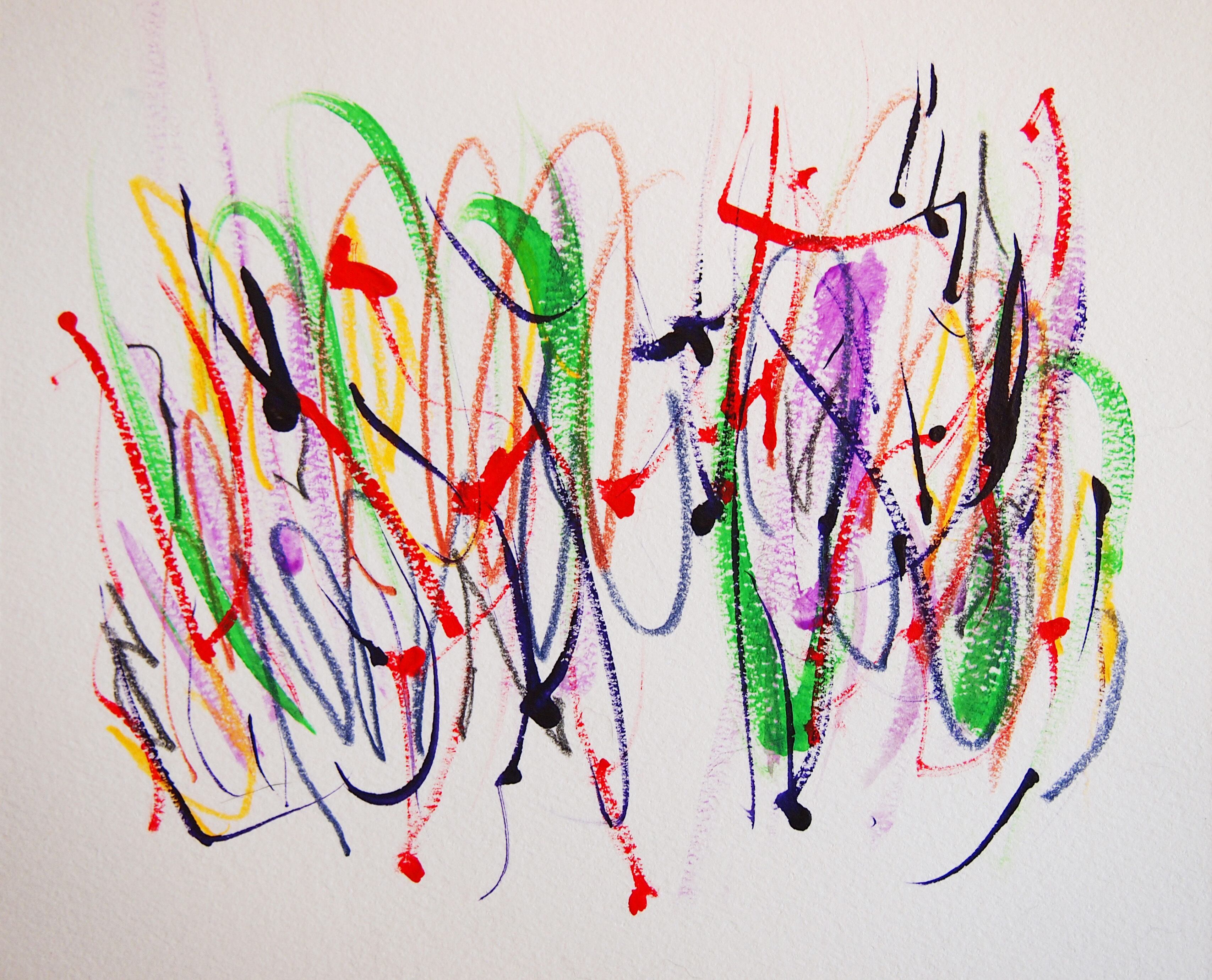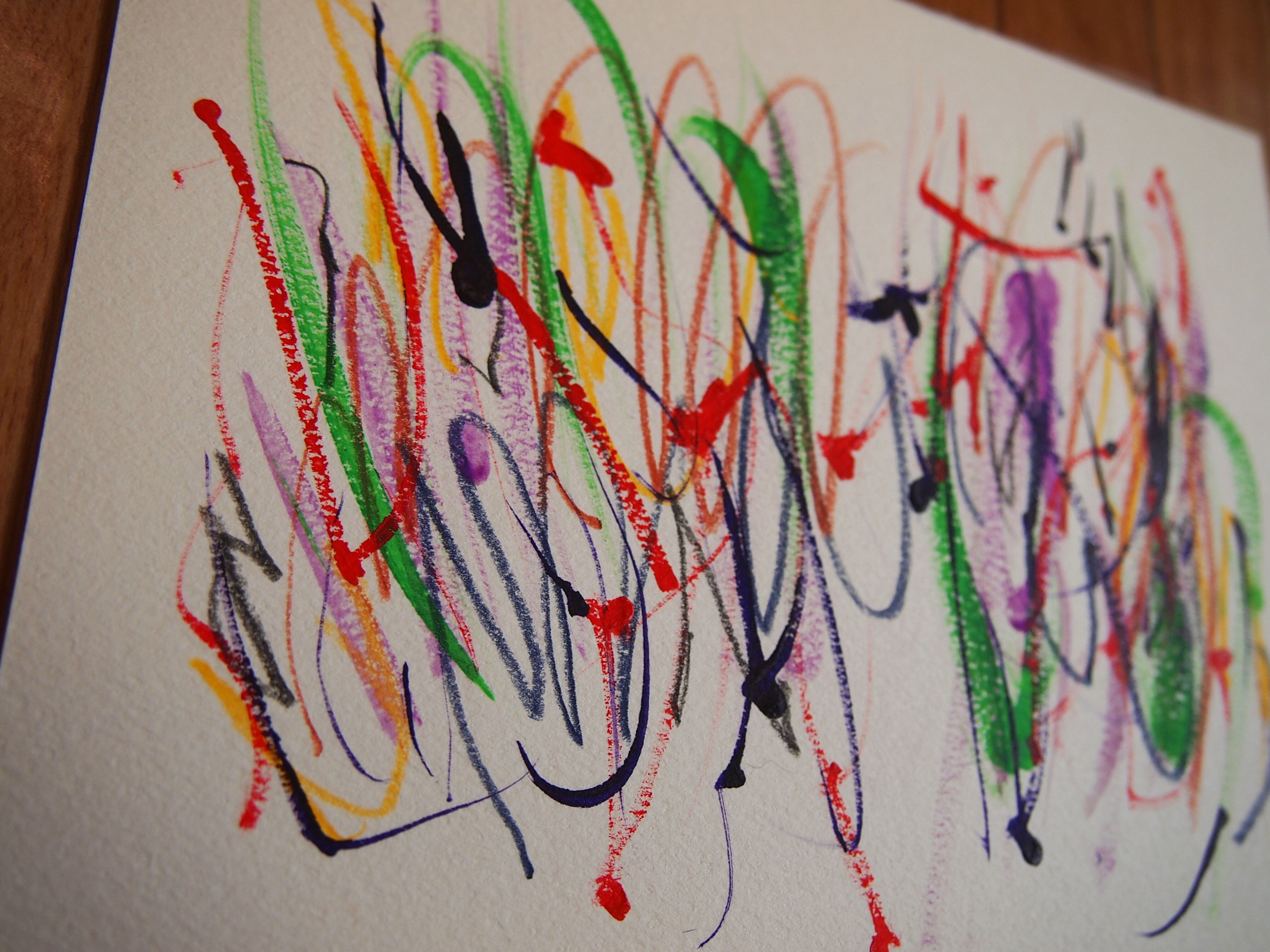赤・緑・紫・黄・橙・青・黒の線が紙の上で重なり合い、まるで感情の波が複層的に交差する即興の地図のよう。