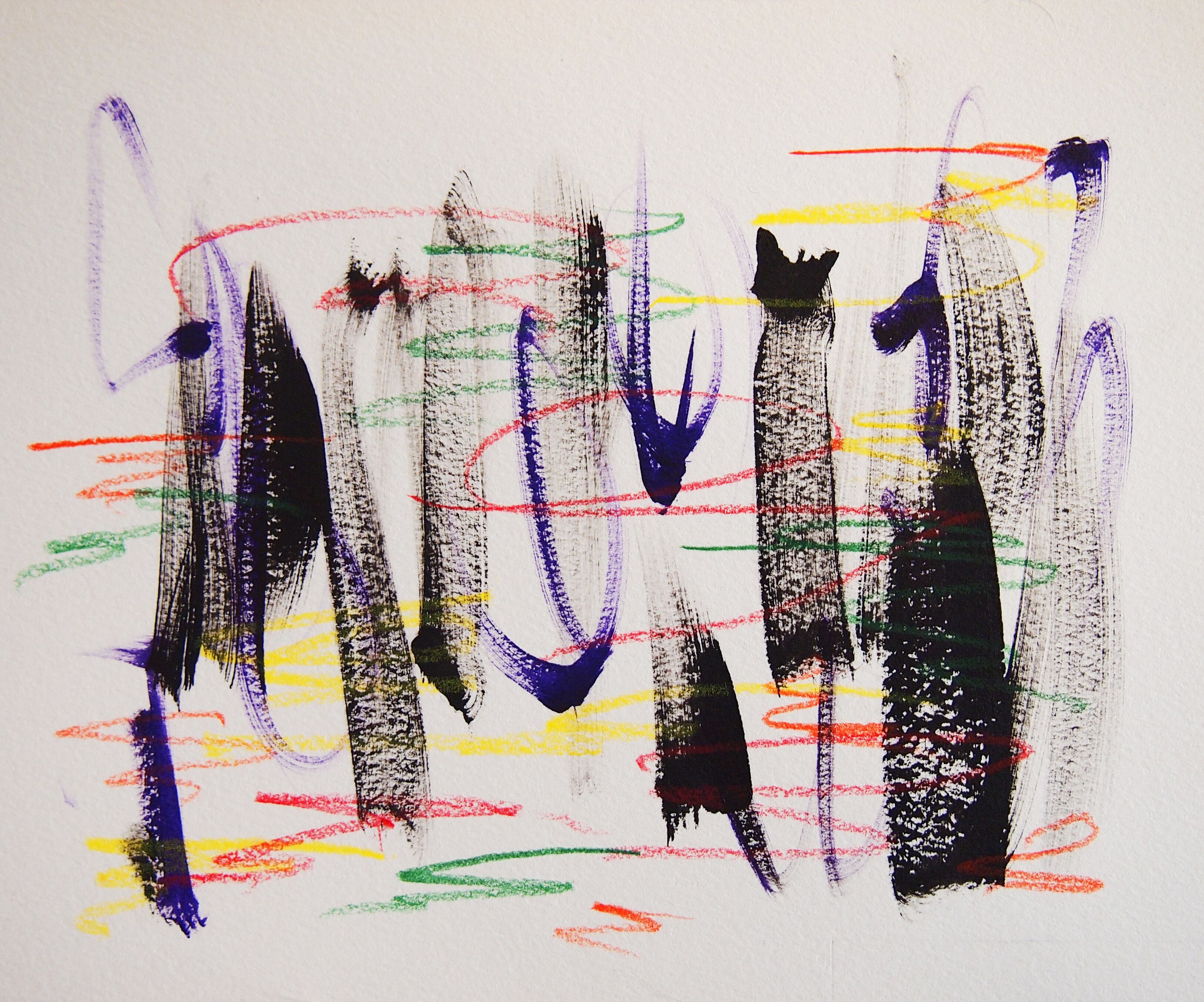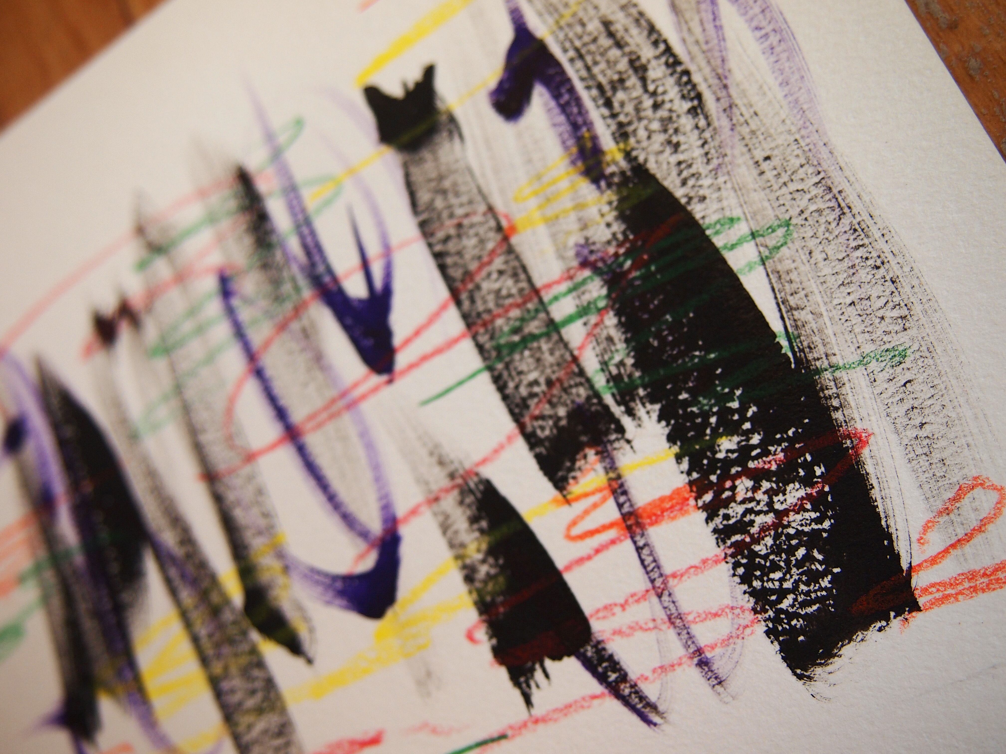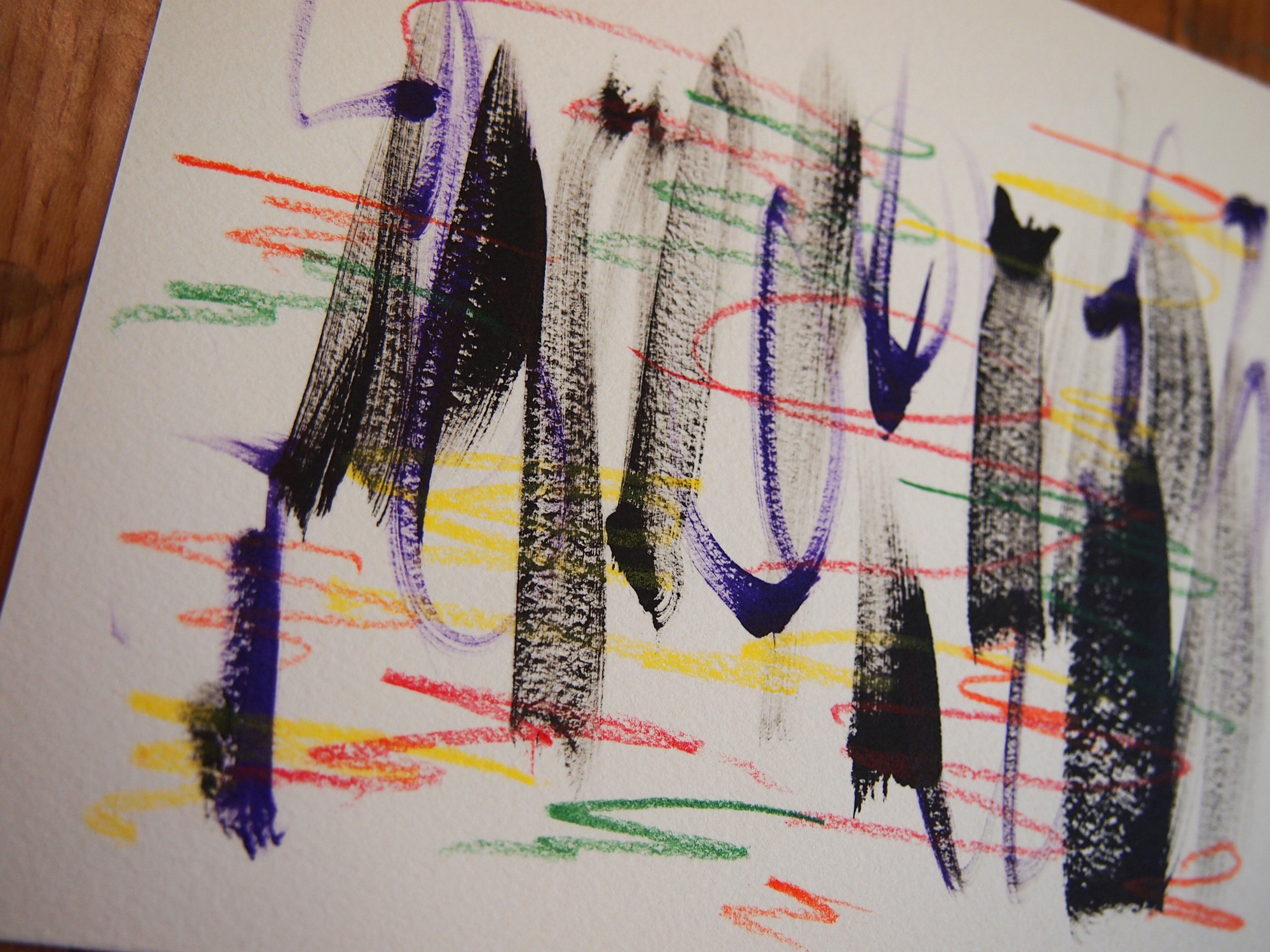 黒の筆跡が紙の上を縦横に走り、赤・黄・緑・紫・ピンクの線がその間を縫うように重なり合う構成は、まるで感情の軌跡が紙の上に刻まれているよう。