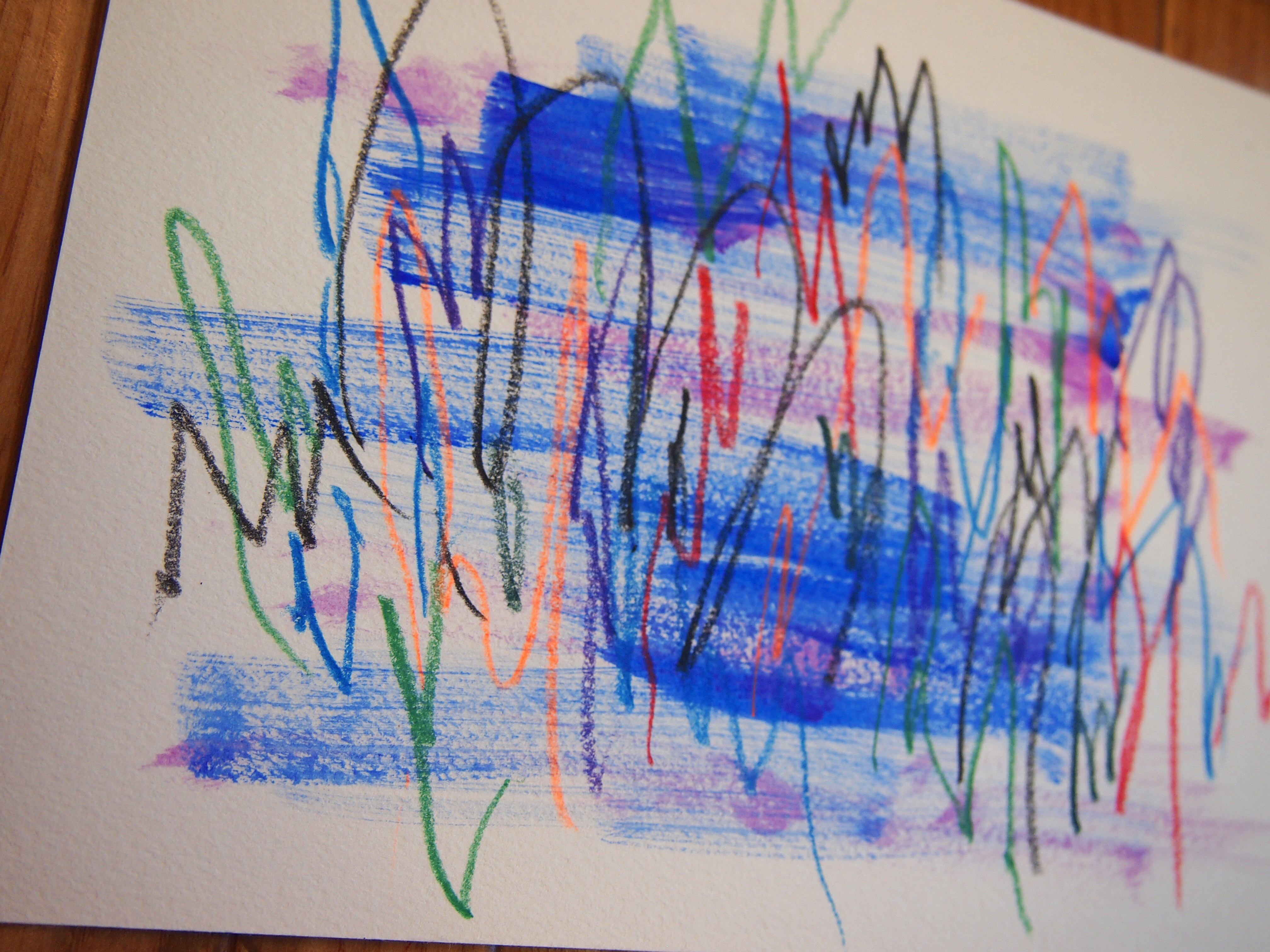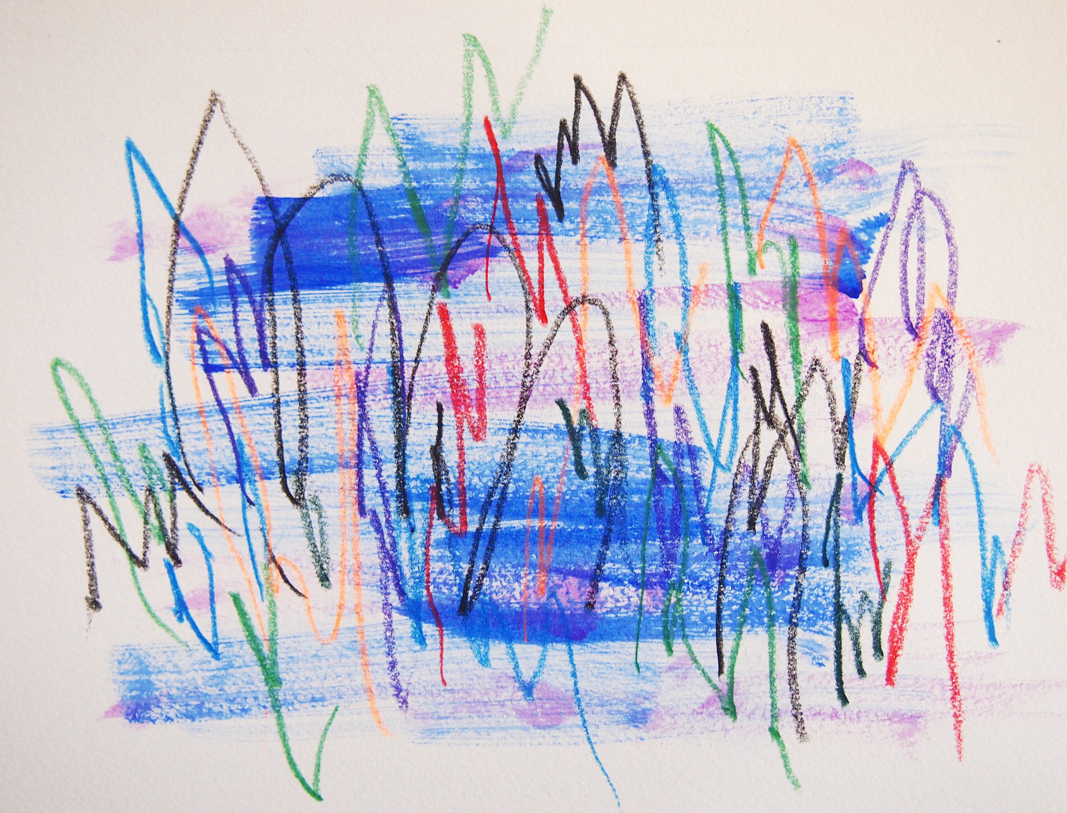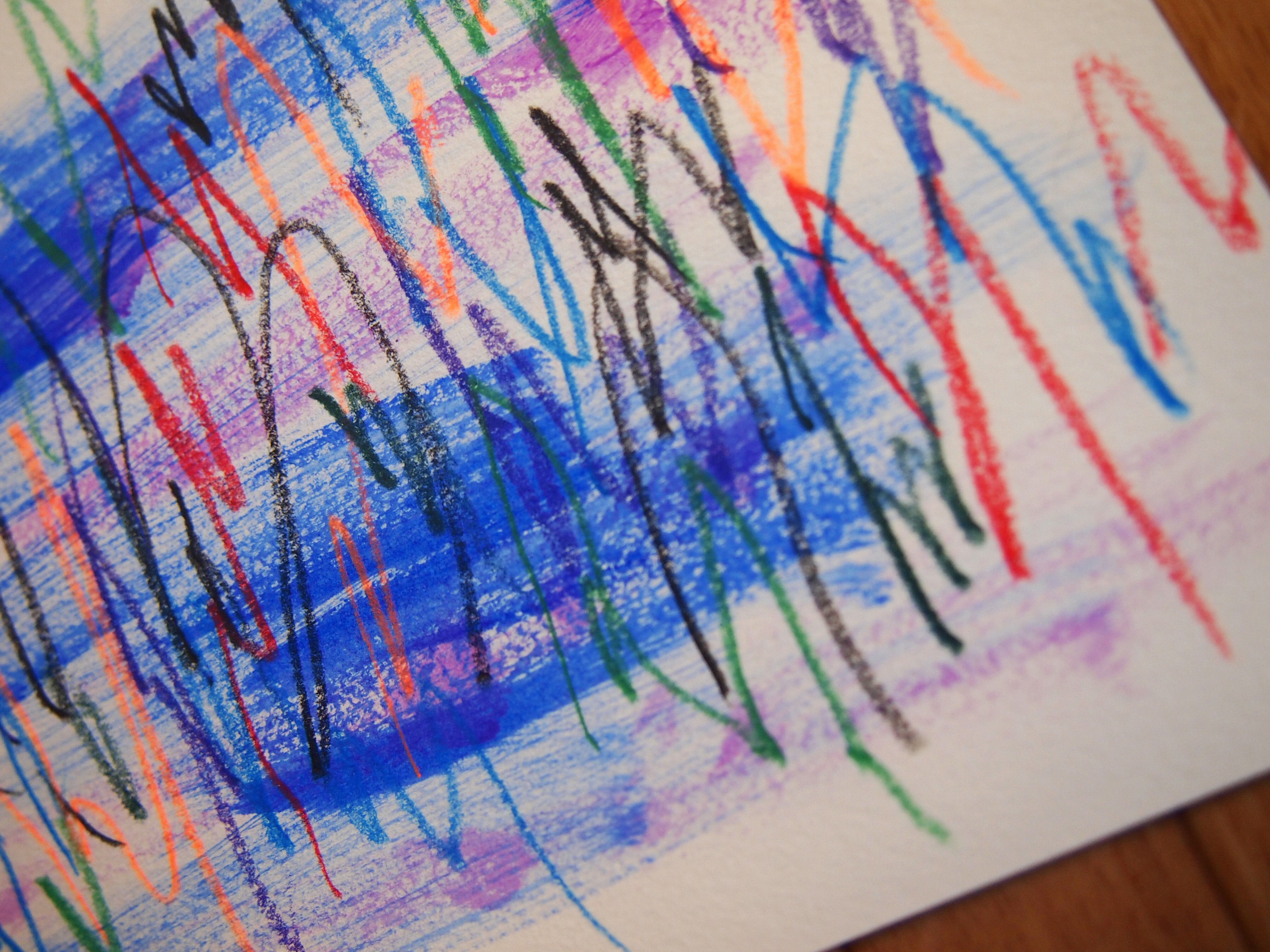 青と紫の水平筆跡が静かな背景をつくり、黒・赤・緑・橙・ピンクの線が前景で踊るように重なり合う構成は、まるで感情の波が紙の上で交差しているよう。